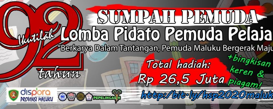 Lomba Pidato Pemuda Pelajar Maluku 2020– Dalam rangka memperingati HARI SUMPAH PEMUDA ke-92 Tahun 2020, Dinas Pemuda dan Olahraga Provinsi Maluku akan melaksanakan Lomba Pidato Pemuda Pelajar Maluku.